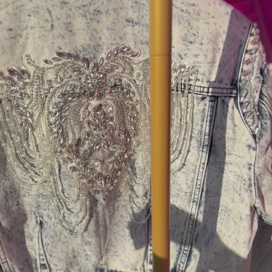 Add some sparkle to your wardrobe with this acid-washed denim jacket featuring beautiful shoulder beading and dazzling stone detailing on the back. The stretch fabric offers comfort and flexibility, while the stunning applique and intricate beadwork make every outfit pop with personality. Perfect for those who love a little extra shine!