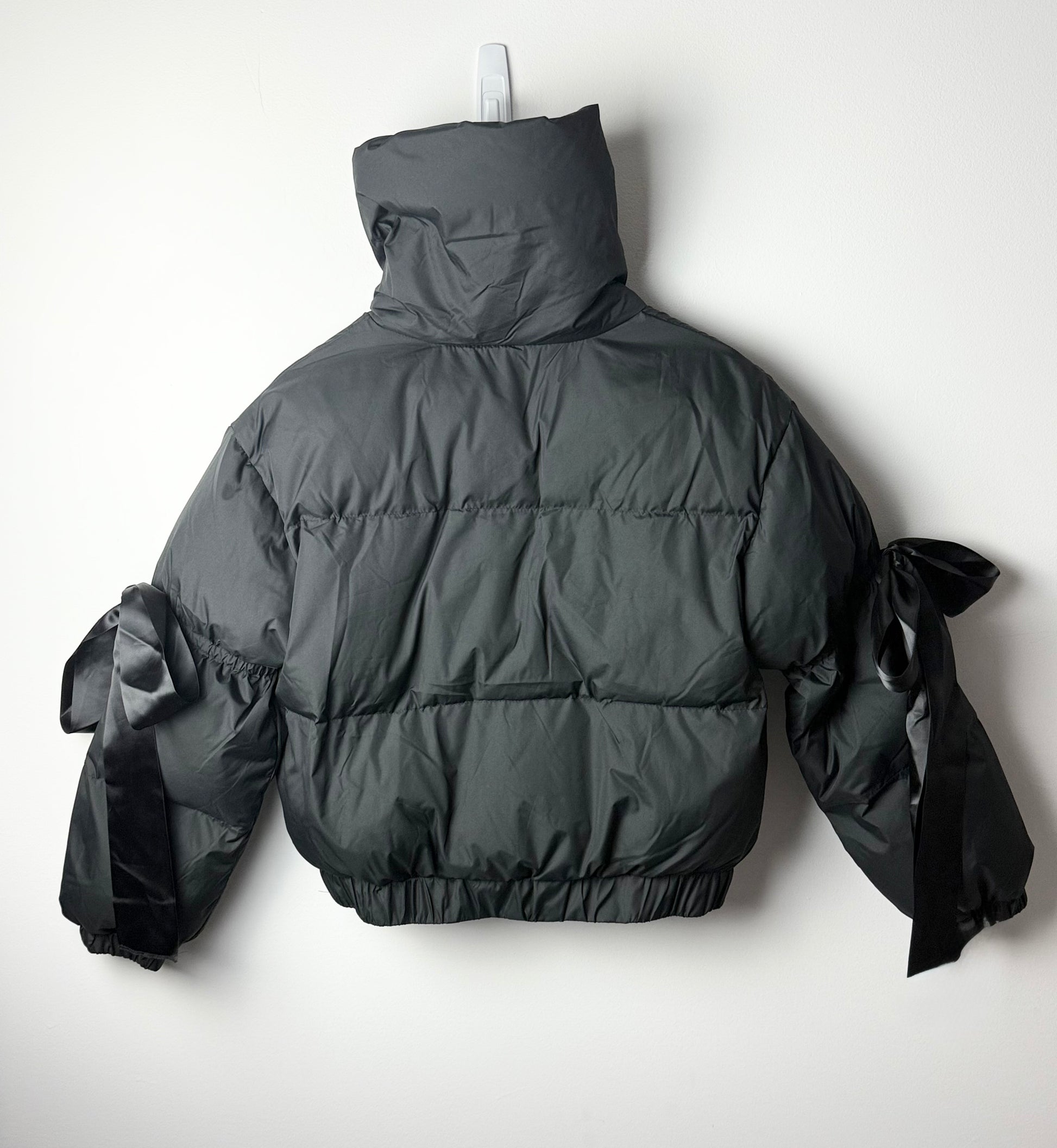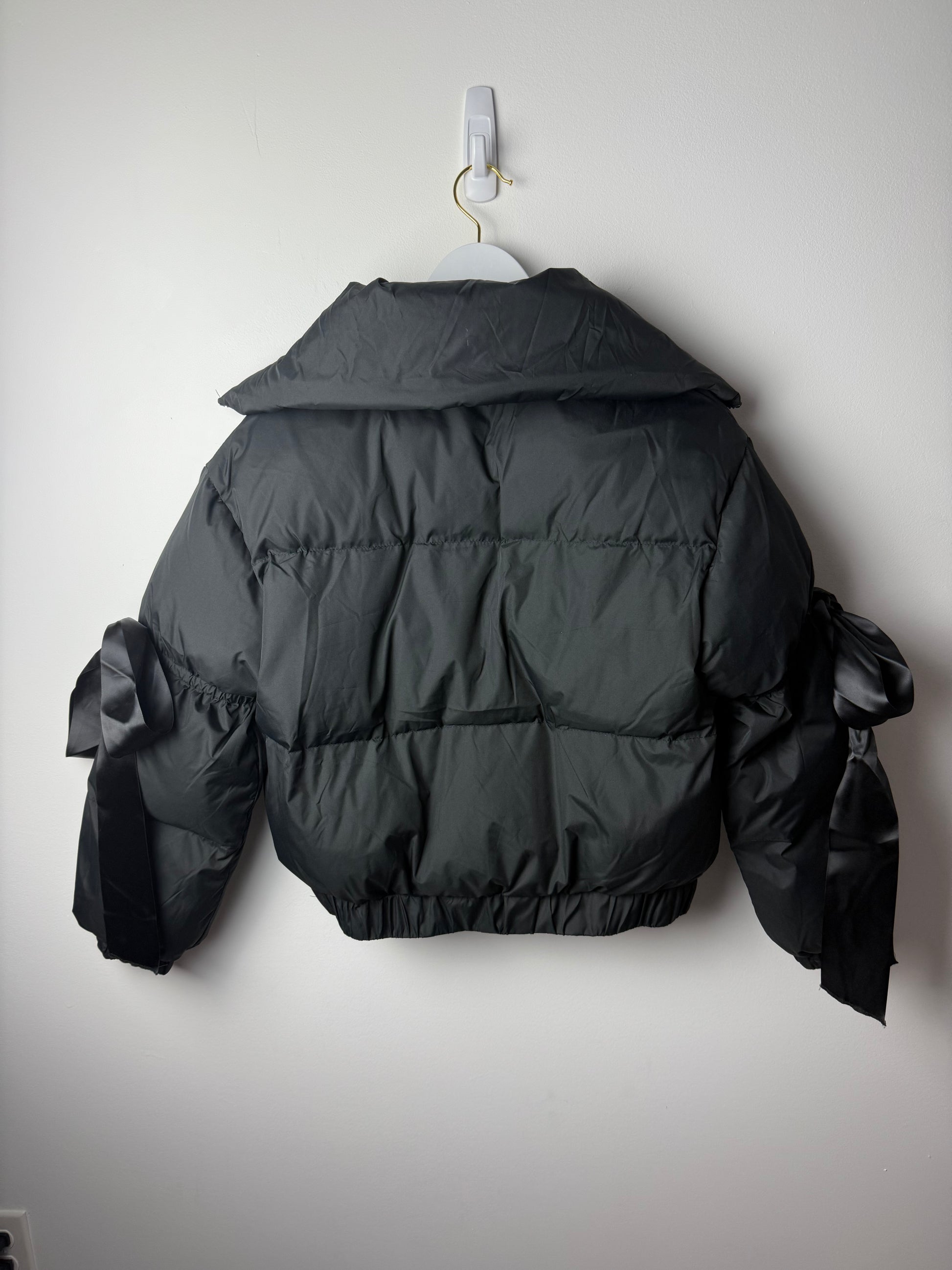 Black puffer jacket with oversized ribbon bow knots at elbows