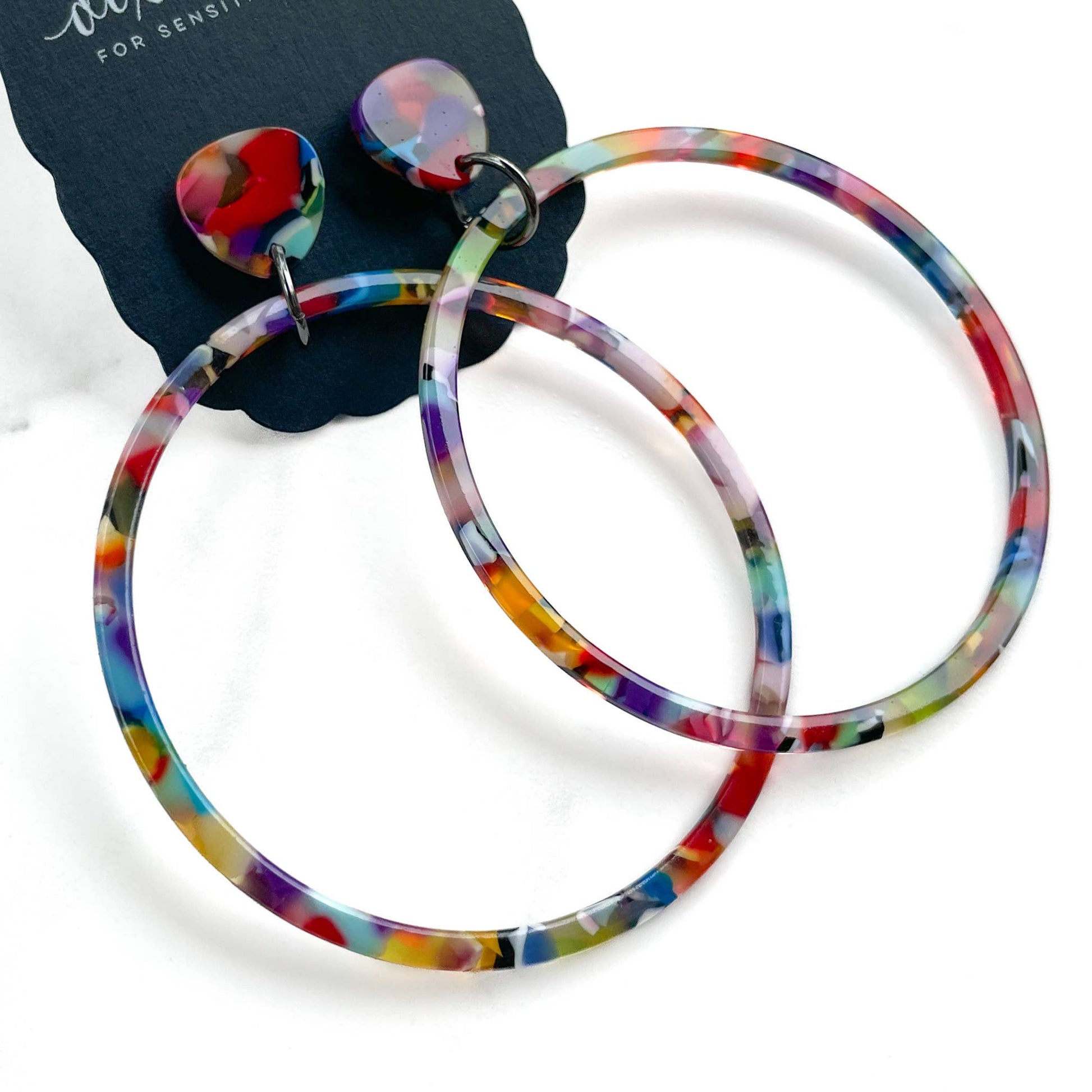 Confidence Hoops in Sprinkles makes a statement and features: *Multi-colored Sprinkles Acrylic Stud *Multi-colored Sprinkles Acrylic Hoop *Measures 3.2" from the top *Posts are Stainless Steel *Great for sensitive ears *Made in the USA