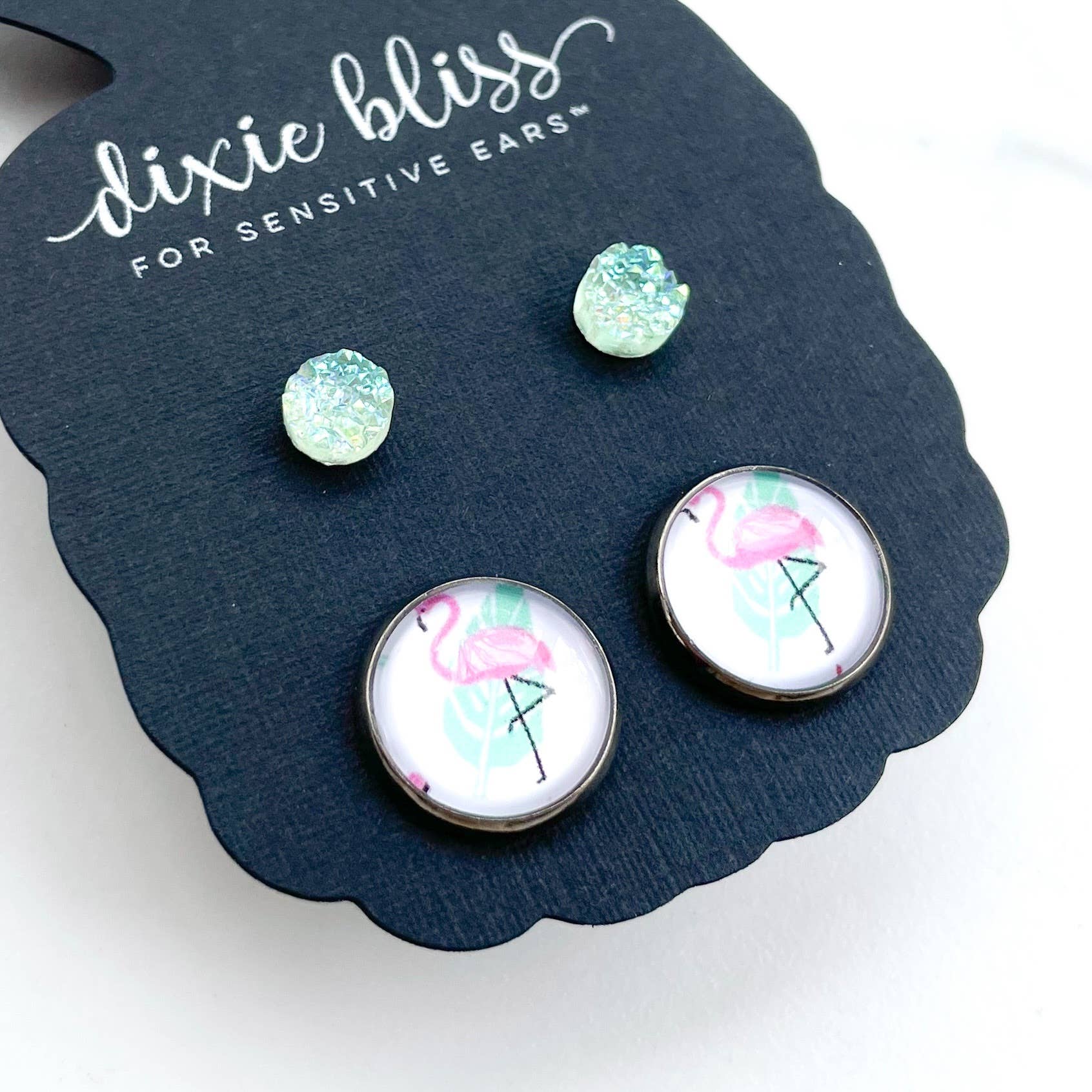 Flirty Flamingo features: *6mm Micro Sea Foam Green Druzy *12mm Flamingo Photo Glass in a Gunmetal-toned Setting *Druzy is on hypoallergenic surgical stainless steel posts *Gunmetal-toned Setting is lead-free and nickel-free brass *Great for sensitive ears! *Made in the USA