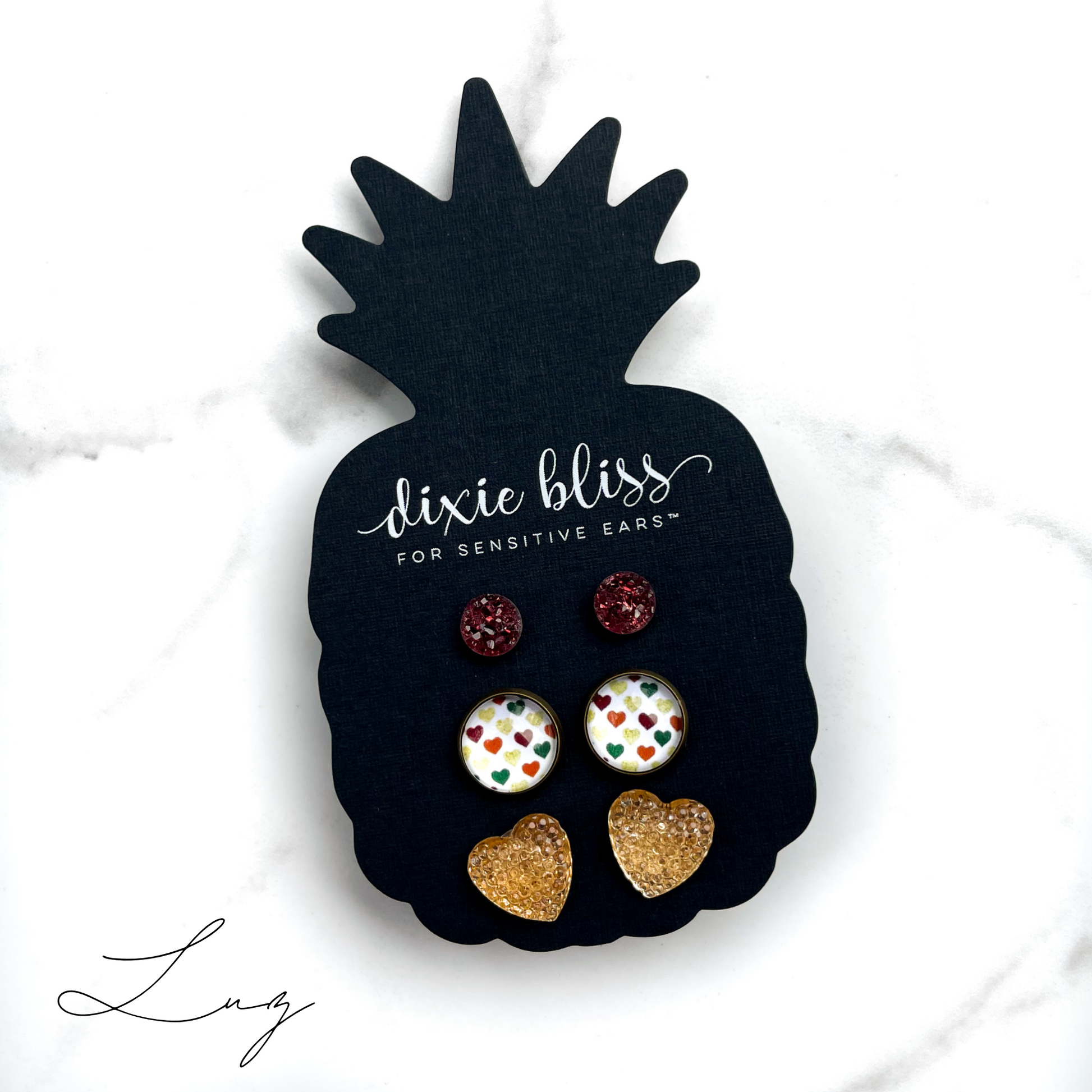 Luz features: *8mm Merlot Crystal Druzy *12mm Jewel-tone Heart Photo Glass in a Bronze-toned Setting *14mm Champagne Honeycomb Heart *Bronze-toned setting and setting post are lead-free and nickel-free brass *Other posts in this set are hypoallergenic surgical stainless steel posts *Great for sensitive ears *Made in the USA