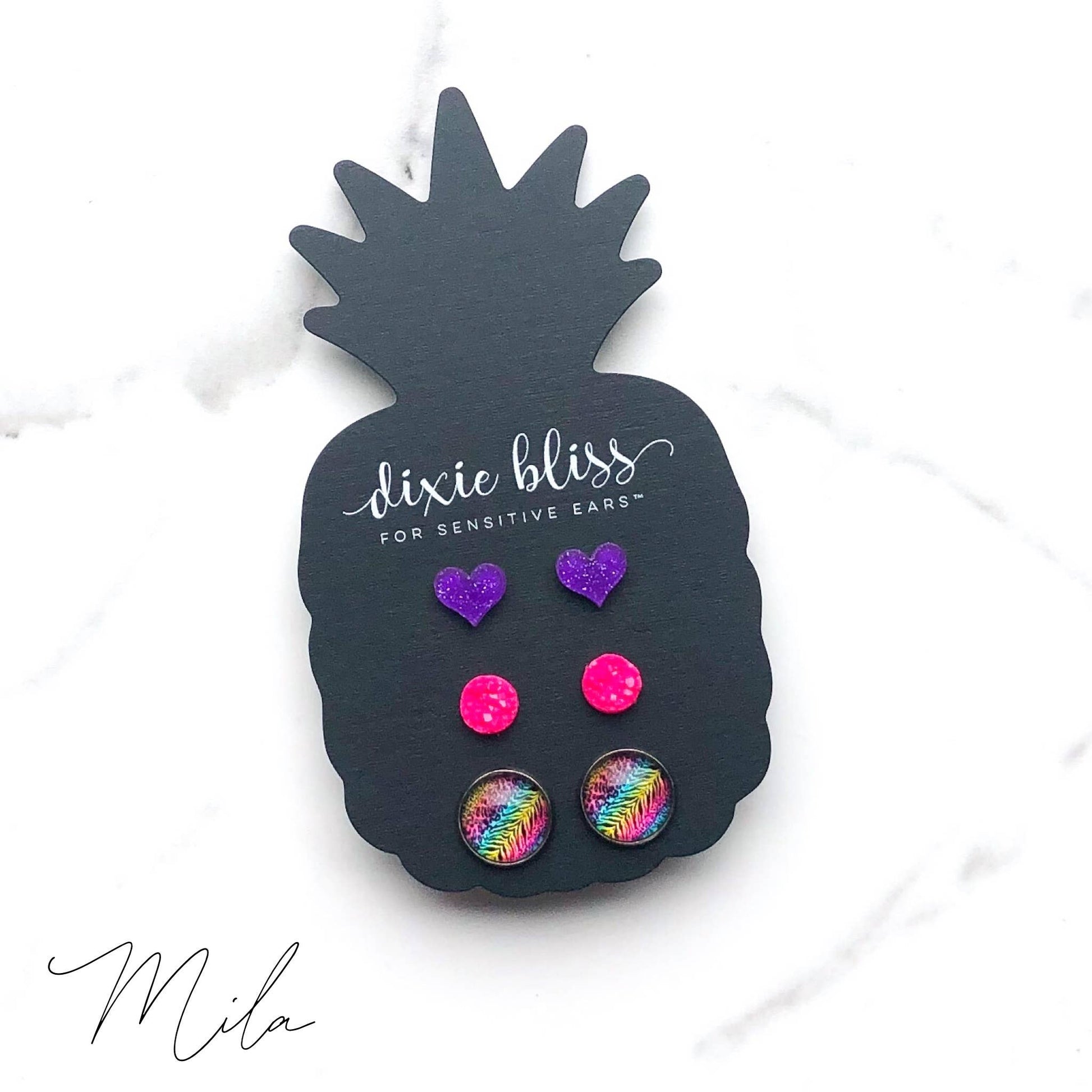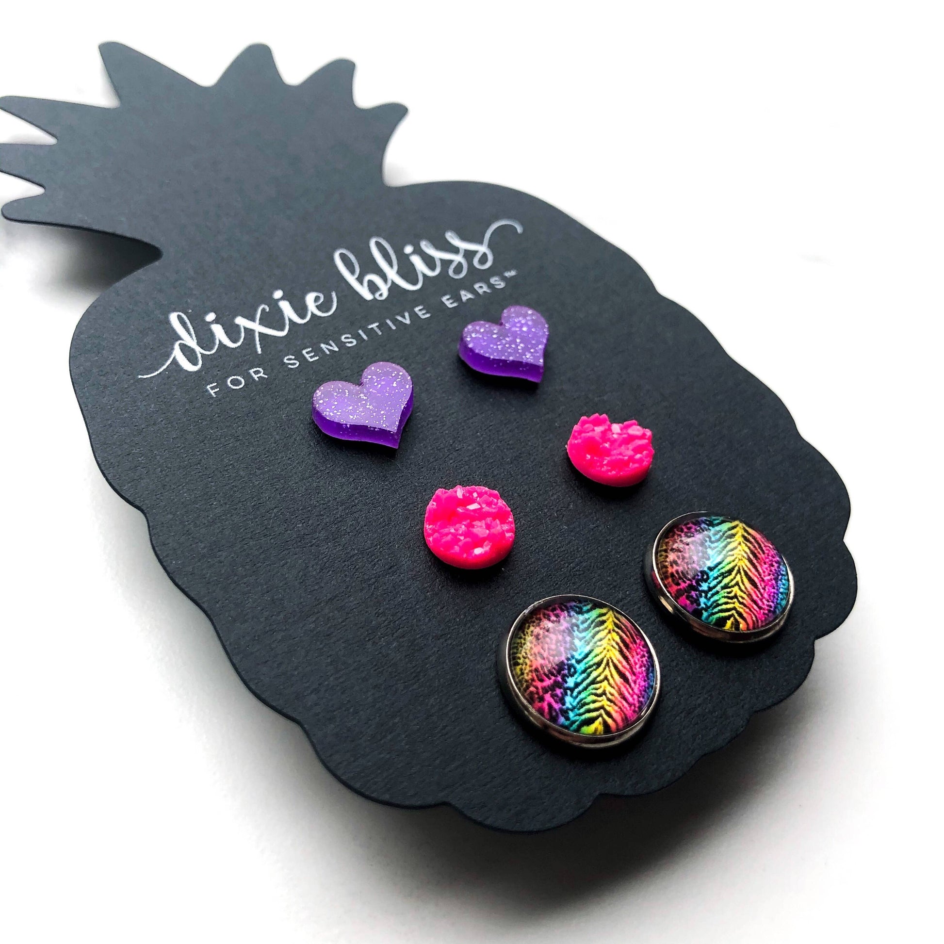 Mila features: *9mm Dixie Exclusive Micro Heart in Purple Shimmer Acrylic *8mm Hot Pink Matte Druzy *12mm Wild Rainbow Photo Glass in a Gunmetal-toned Setting. *Gunmetal-toned setting and setting post are lead-free and nickel-free brass *Other posts in this set are hypoallergenic surgical stainless steel posts *Great for sensitive ears *Made in the USA
